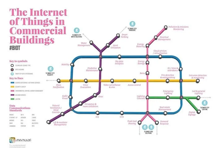 Typically, IoT leverages the interconnectivity between the sensors and actuators in different devices within a commercial building, in consideration with occupant needs and building efficiency goals through an IoT platform, that results in energy savings. This process and the concept of automated actions based on preset baselines is what is generally referred to as Smart Buildings. This concept is illustrated in the diagram below